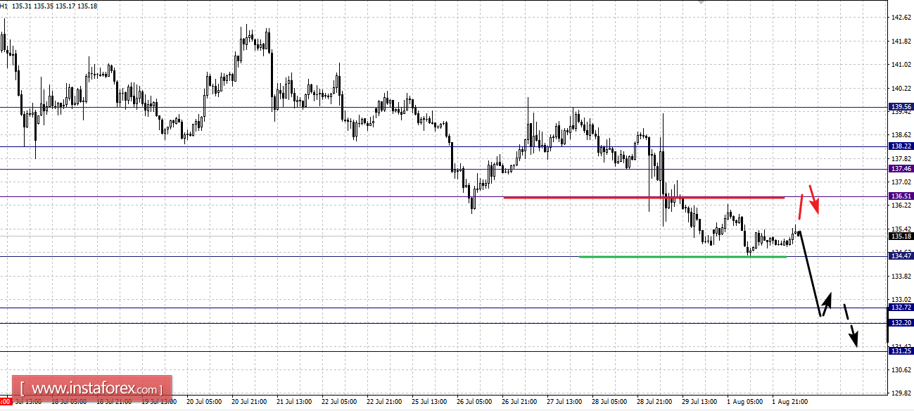 Краткосрочное восходящее движение возможно после пробоя 136.51, здесь цель – 137.46, в коридоре 137.46 – 138.22, также ожидаем краткосрочное движение кверху. Уровень 138.22 является ключевым сопротивлением для последующего развития восходящей структуры, его проход ценой приведет к выраженному движению, здесь цель – 139.55.