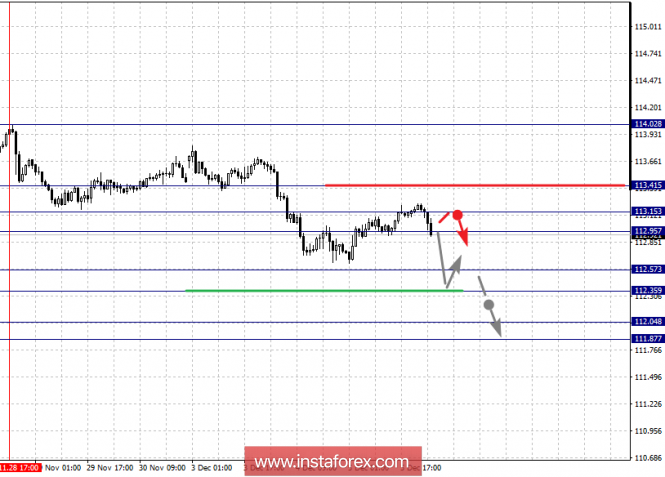 По паре Доллар/Иена ключевыми уровнями в масштабе являются: 113.41, 113.15, 112.95, 112.57, 112.35, 112.04 и 111.87. Здесь мы следим за развитием нисходящего цикла от 28 ноября. Краткосрочное нисходящее движение возможно в коридоре 112.57 – 112.35, пробой последнего значения приведет к выраженному движению, здесь цель – 112.04. Потенциальным значением для низа считаем уровень 111.87, по достижении которого ожидаем откат кверху.