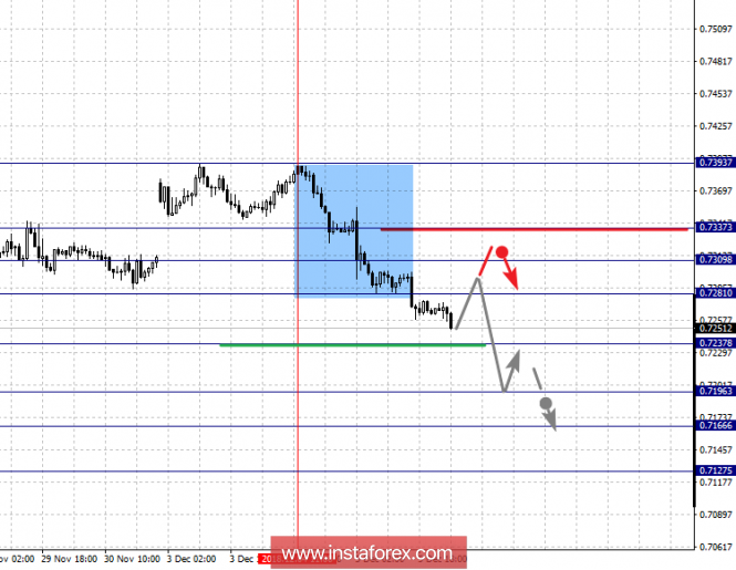 Краткосрочное восходящее движение возможно в коридоре 0.7281 – 0.7309, пробой последнего значения приведет к углубленной коррекции, здесь цель – 0.7337, этот уровень является ключевой поддержкой для нисходящей структуры от 4 декабря.
