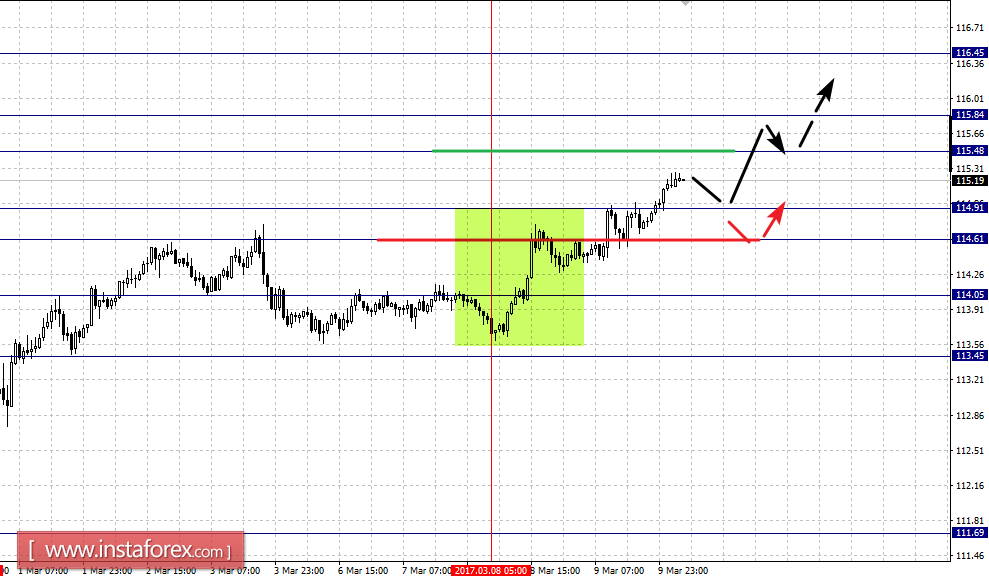 Краткосрочное нисходящее движение возможно в коридоре 114.91 – 114.61, пробой последнего значения приведет к углубленному движению, здесь цель – 114.05, этот уровень является ключевой поддержкой для верха, его проход ценой будет располагать к развитию нисходящей структуры, в данном случае первая потенциальная цель – 113.45.