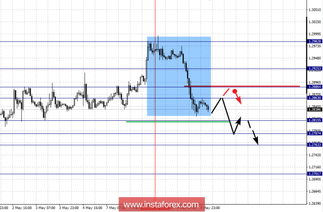 Краткосрочное восходящее движение возможно в коридоре 1.2863 – 1.2886, пробой последнего значения приведет к углубленной коррекции, здесь цель – 1.2925, этот уровень является ключевой поддержкой для нисходящей структуры от 8 мая.