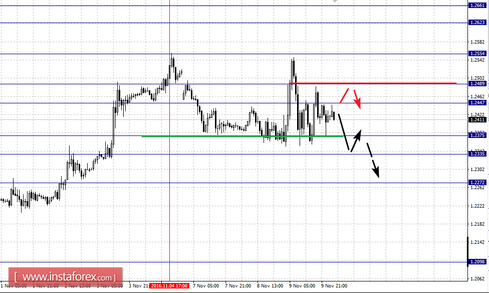 Краткосрочное восходящее движение возможно в коридоре 1.2447 – 1.2489, пробой последнего значения будет располагать к развитию восходящей тенденции, здесь цель – 1.2554, возле этого уровня консолидация. Потенциальным значением для верха пока считаем уровень 1.2623.
