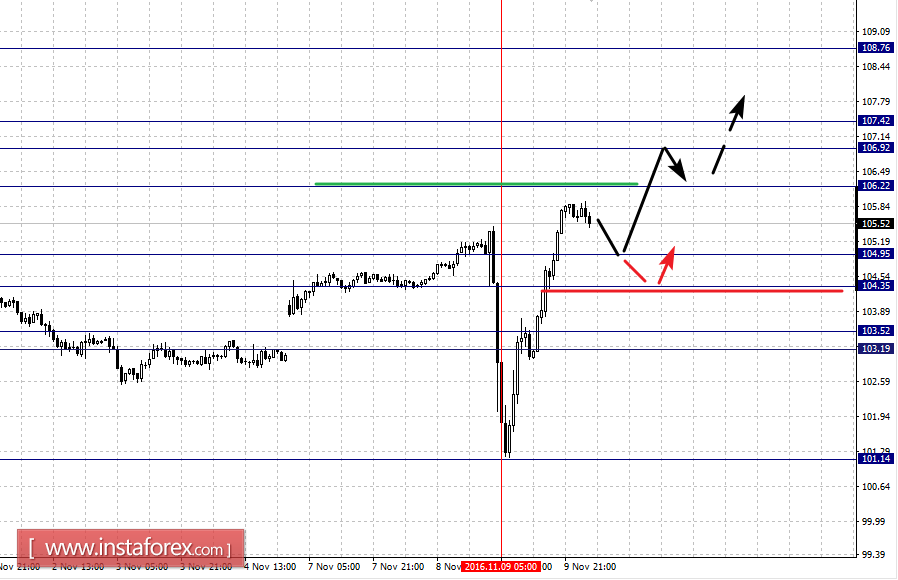 Краткосрочное нисходящее движение возможно в коридоре 104.95 – 104.35, пробой последнего значения приведет к углубленной коррекции, здесь цель – 103.52, диапазон 103.52 – 103.19 является ключевой поддержкой для верха.