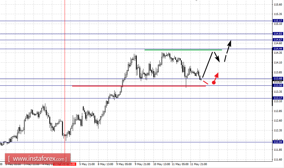 Краткосрочное нисходящее движение возможно в коридоре 113.68 – 113.50, пробой последнего значения приведет к углубленному движению, здесь цель – 113.17, этот уровень является ключевой поддержкой для верха.