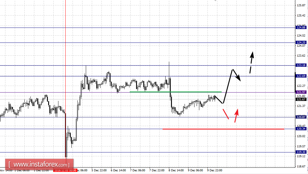 По паре Евро/Доллар следим за формированием нисходящей структуры от 8 декабря, на текущий момент цена находится в зоне начальных условий. По паре Фунт/Доллар следим за нисходящей структурой от 6 декабря. По паре Доллар/Франк полноценного развития восходящей тенденции от 8 декабря, ожидаем после пробоя 1.0215. По паре Доллар/Иена последующие цели для верха определили от восходящей структуры 28 ноября. По паре Евро/Иена продолжения движения кверху ожидаем после пробоя 122.00. По паре Фунт/Иена последующие цели для восходящего движения определили от локальной структуры 7 декабря.