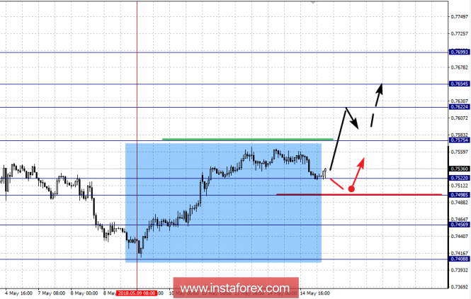 Краткосрочное нисходящее движение возможно в коридоре 0.7522 – 0.7498, пробой последнего значения приведет к углубленной коррекции, здесь цель – 0.7456, этот уровень является ключевой поддержкой для восходящей структуры.