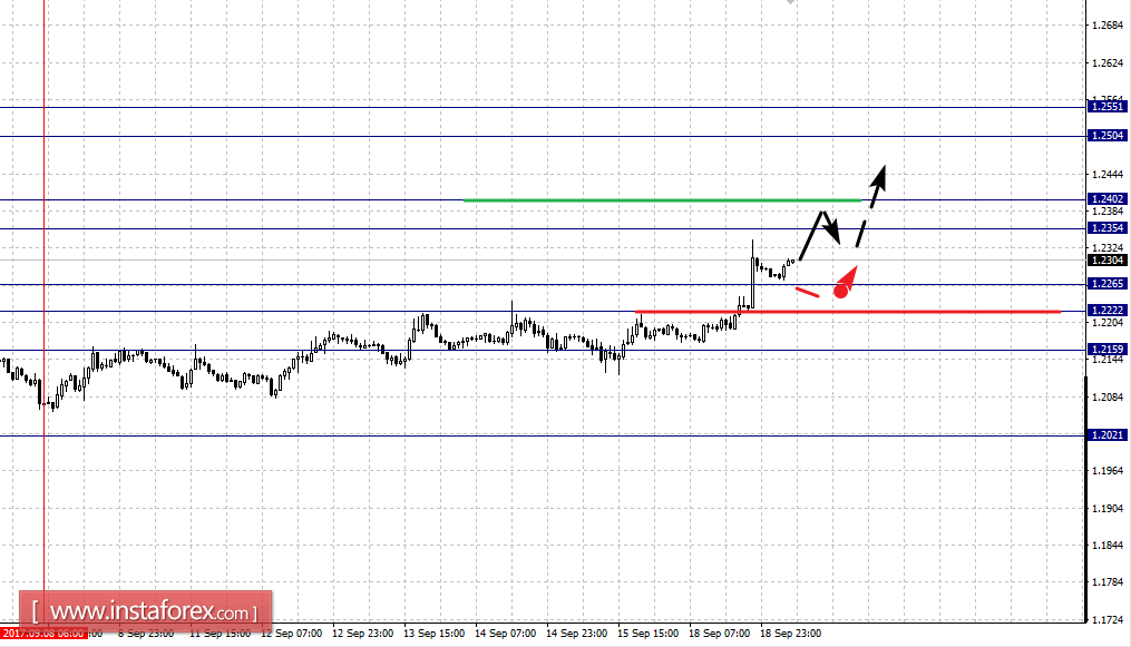 Краткосрочное нисходящее движение возможно в коридоре 1.2265 – 1.2222, пробой последнего значения приведет к углубленной коррекции, здесь цель – 1.2159, этот уровень является ключевой поддержкой для верха, его пробой будет располагать к развитию нисходящей структуры, в данном случае потенциальная цель – 1.2021.