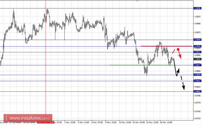 Краткосрочное восходящее движение возможно в коридоре 0.9914 – 0.9930, пробой последнего значения приведет к углубленной коррекции, здесь цель – 0.9949.