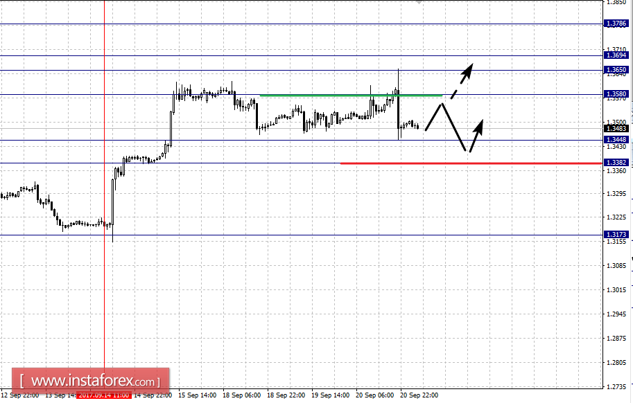 Краткосрочное нисходящее движение возможно в коридоре 1.3448 – 1.3382, пробой последнего значения приведет к развитию нисходящей структуры, в данном случае потенциальная цель – 1.3173.