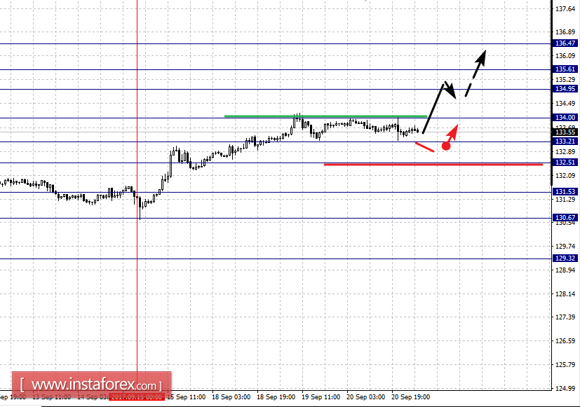 Краткосрочное нисходящее движение возможно в коридоре 133.21 – 132.51, пробой последнего значения приведет к формированию нисходящей структуры, здесь цель – 131.53, этот уровень является ключевым сопротивлением для последующего развития нисходящей тенденции.