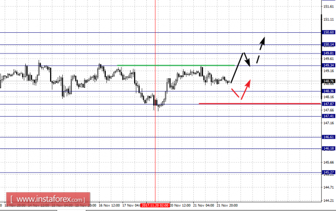 Пробой уровня 149.34 будет располагать к развитию восходящей структуры от 20 ноября, в данном случае цель – 149.81, в коридоре 149.81 – 150.14 консолидация цены. Потенциальным значением для верха считаем уровень 150.60.