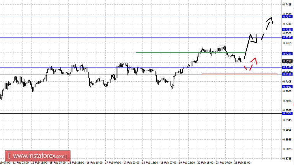 Краткосрочное движение книзу возможно в коридоре 0.7163 – 0.7136, пробой последнего значения приведет к углубленной коррекции, здесь цель – 0.7085, этот уровень является ключевой поддержкой для верха.