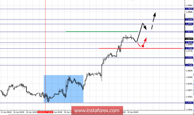Краткосрочное нисходящее движение возможно в коридоре 1.2819 – 1.2790, пробой последнего значения приведет к углубленной коррекции, здесь цель – 1.2745, этот уровень является ключевой поддержкой для верха от 17 апреля, его пробой будет располагать к формированию начальных условий для нисходящего цикла, в данном случае цель – 1.2708.