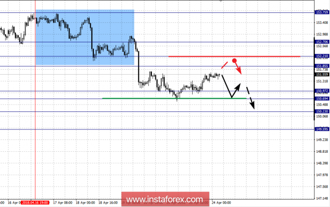 По паре Фунт/Иена ключевыми уровнями в масштабе Н1 являются: 152.70, 152.21, 151.85, 150.97, 150.69, 150.23 и 149.59. Здесь мы следим за нисходящей структурой от 16 апреля. Продолжения движения книзу ожидаем после прохода ценой шумового диапазона 150.97 – 150.69, в данном случае цель – 150.23, возле этого уровня консолидация. Потенциальным значением для верха считаем уровень 149.59, по достижении которого ожидаем откат в коррекцию.