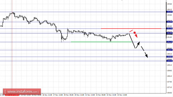 Краткосрочное восходящее движение ожидаем в коридоре 131.98 – 132.39, пробой последнего значения приведет к углубленному движению, здесь цель – 132.99, этот уровень является ключевой поддержкой для нисходящей структуры от 14 ноября.