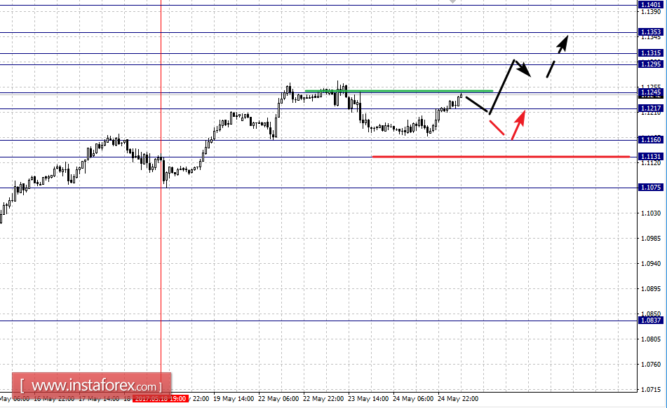 По паре Евро/Доллар ожидаем возобновления восходящей тенденции после прохода ценой шумового диапазона 1.1217 – 1.1245. По паре Фунт/Доллар мы следим за формированием восходящей структуры от 12 мая, развитие которой ожидаем после пробоя 1.3096. По паре Доллар/Франк продолжения движения книзу ожидаем после пробоя 0.9683. По паре Доллар/Иена цена находится в корректировочной области от нисходящей структуры 10 мая. По паре Евро/Иена мы расширили потенциал для верха до уровня 128.28. По паре Фунт/Иена цена формирует потенциал для верха от 17 мая в области коррекции нисходящей структуры.