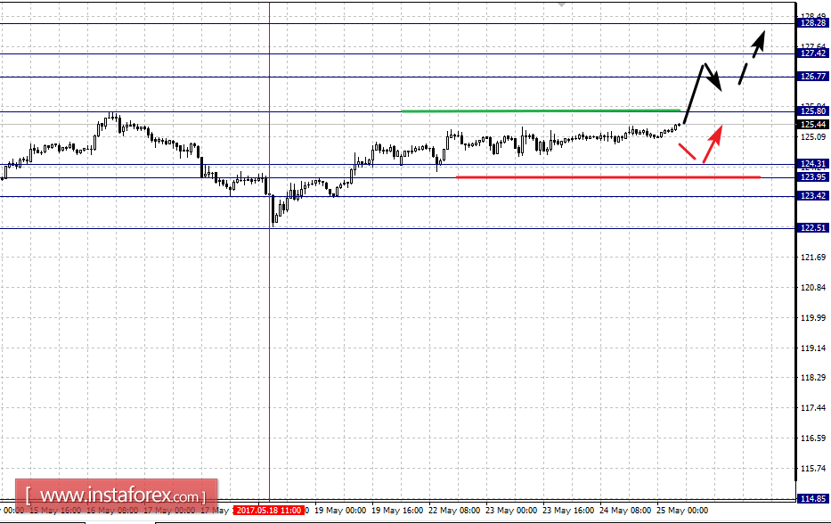 По паре Евро/Иена ключевыми уровнями в масштабе Н1 являются: 128.28, 127.42, 126.77, 125.80, 124.31, 123.95, 123.42 и 122.51. Здесь мы следим за восходящей структурой от 18 мая. Продолжения движения кверху ожидаем после пробоя 125.80, в данном случае цель – 126.77, в коридоре 126.77 – 127.42 консолидация цены. Потенциальным значением для верха считаем уровень 128.28, по достижении которого ожидаем откат книзу.