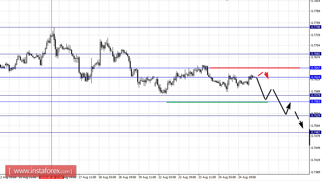 Краткосрочное восходящее движение возможно в коридоре 0.7624 – 0.7647, пробой последнего значения приведет к углубленной коррекции, здесь цель – 0.7682, этот уровень является ключевым сопротивлением для восходящего движения.