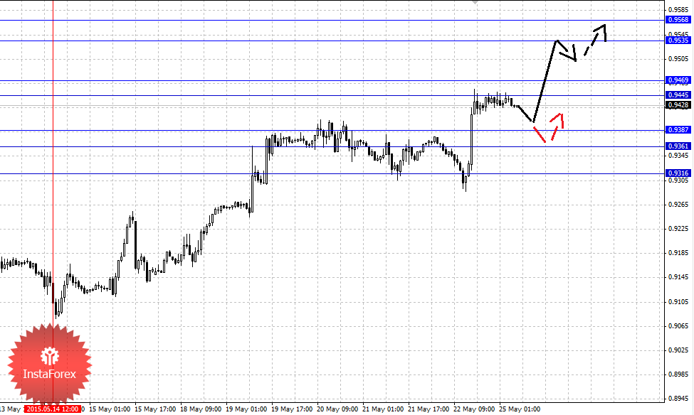 По паре Доллар/Франк ключевыми уровня в масштабе Н1 являются: 0.9568, 0.9535, 0.9469, 0.9445, 0.9387, 0.9361 и 0.9316. Здесь мы продолжаем следить за развитием восходящей структуры от 14 мая, также от 22 мая формируется локальный потенциал для продолжения движения кверху. Проход ценой шумового диапазона 0.9445 – 0.9469 должен сопровождаться выраженным восходящим движением, здесь цель – 0.9535. Потенциальным значением для верха считаем уровень 0.9568, по достижении которого ожидаем консолидацию цены. Краткосрочное нисходящее движение возможно в коридоре 0.9387 – 0.9361, пробой последнего значения приведет к углубленной коррекции, здесь цель – 0.9316.