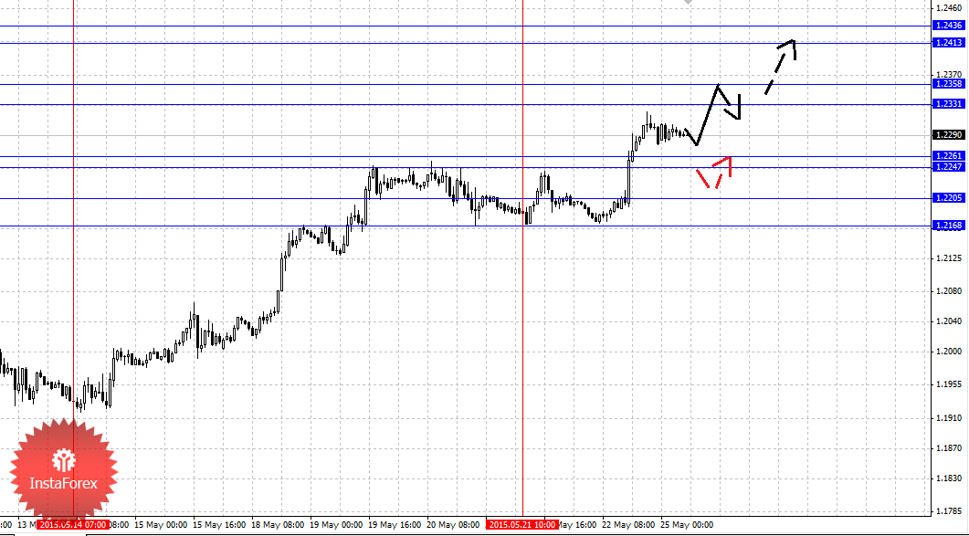 По паре Доллар/Канадский доллар ключевыми уровнями в масштабе Н1 являются: 1.2436, 1.2413, 1.2358, 1.2331, 1.2261, 1.2247, 1.2205 и 1.2168. Здесь последующие цели для верха мы определили от локальной структуры 21 мая. Краткосрочное восходящее движение возможно в коридоре 1.2331 – 1.2358, пробой последнего значения должен сопровождаться выраженным движением кверху, здесь цель – 1.2431, в коридоре 1.2413 – 1.2436 консолидация цены. Краткосрочное нисходящее движение возможно в диапазоне 1.2247 – 1.2205, последний является ключевой поддержкой для верха, его проход ценой будет располагать к развитию нисходящей структуры.