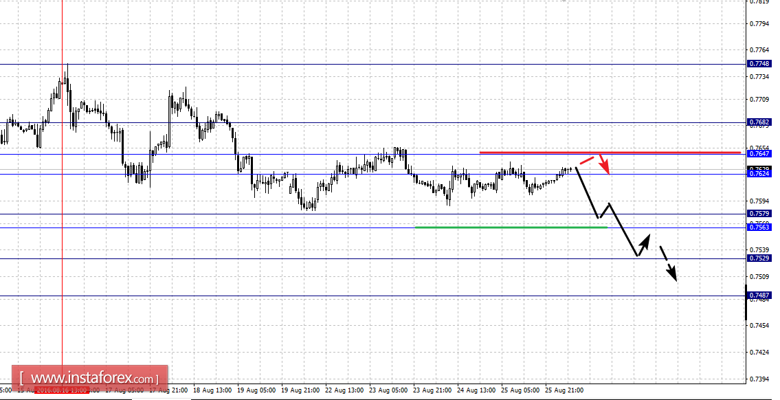 Краткосрочное восходящее движение возможно в коридоре 0.7624 – 0.7647, пробой последнего значения приведет к углубленной коррекции, здесь цель – 0.7682, этот уровень является ключевым сопротивлением для восходящего движения.