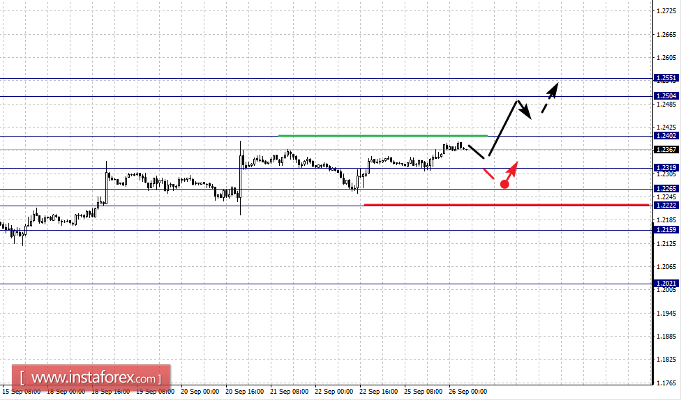 Уход в корректировочную зону возможен после пробоя 1.2319, здесь цель – 1.2265, в коридоре 1.2265 – 1.2222 краткосрочное нисходящее движение, пробой последнего значения приведет к углубленной коррекции, здесь цель – 1.2159, этот уровень является ключевой поддержкой для верха, его пробой будет располагать к развитию нисходящей структуры, в данном случае потенциальная цель – 1.2021.