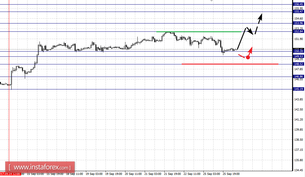 Краткосрочное нисходящее движение возможно в коридоре 150.20 – 149.53, пробой последнего значения приведет к углубленной коррекции, здесь цель – 148.52, этот уровень является ключевой поддержкой для верха, его пробой будет располагать к развитию нисходящей структуры.