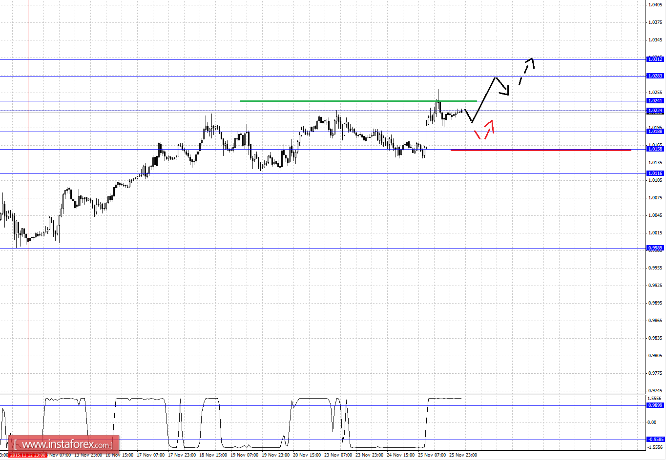 Краткосрочное нисходящее движение возможно в коридоре 1.0188 – 1.0158, пробой последнего значения приведет к углубленной коррекции, здесь цель – 1.0116, этот уровень является ключевой поддержкой для верха.