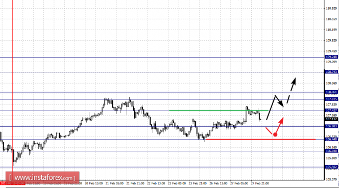 По паре Евро/Доллар продолжения движения книзу ожидаем после пробоя 1.2225, потенциал для верха по-прежнему находится на отметке 1.2084. По паре Фунт/Доллар возобновления восходящего движения ожидаем после пробоя 1.4002, уровень 1.3852 является ключевой поддержкой для верха. По паре Доллар/Франк мы ожидаем движение к уровню 0.9426. По паре Доллар/Иена развития восходящей структуры от 16 февраля ожидаем после пробоя 107.42. По паре Евро/Иена ожидаем движение к уровню 130.48, движение кверху рассматриваем в качестве коррекции, уровень 131.82 ключевая поддержка. По паре Фунт/Иена ожидаем движение к уровню 147.11, движение кверху рассматриваем в качестве коррекции.