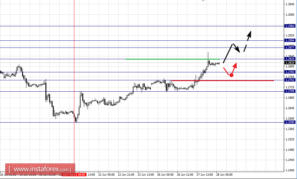 Краткосрочное нисходящее движение возможно в коридоре 1.2783 – 1.2752, пробой последнего значения приведет к углубленному движению, здесь цель – 1.2709.