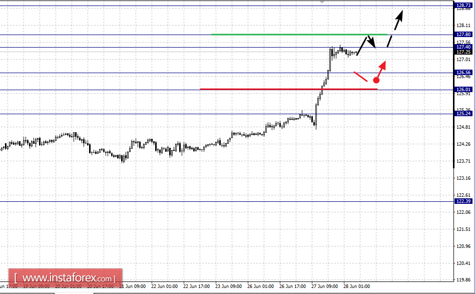 По паре Евро/Иена ключевыми уровнями в масштабе Н1 являются: 128.73, 127.80, 127.40, 126.56, 126.01 и 125.24. Здесь мы продолжаем следить за восходящей структурой от 15 июня. Продолжения движения кверху ожидаем после прохода ценой шумового диапазона 127.40 – 127.80, в данном случае цель – 128.73, от этого уровня ожидаем уход в коррекцию.