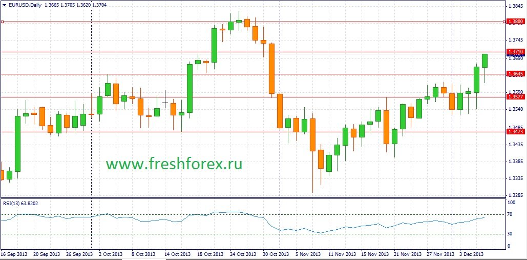 Пятничный отчет по рынку труда преподнес участникам рынка приятный сюрприз, в виде роста показателя Non-Farm до отметки 203 000. Однако европейская валюта отреагировала на это событие лишь технической коррекцией, после чего рост котировок продолжился. Так же наблюдался мощный рост и на ведущих мировых фондовых площадках. Можно сделать вывод, что позитивная американская статистика не смогла убедить инвесторов в том, что Федрезерв пойдет на сокращение программы QE3 на ближайшем заседании 17-18 декабря.