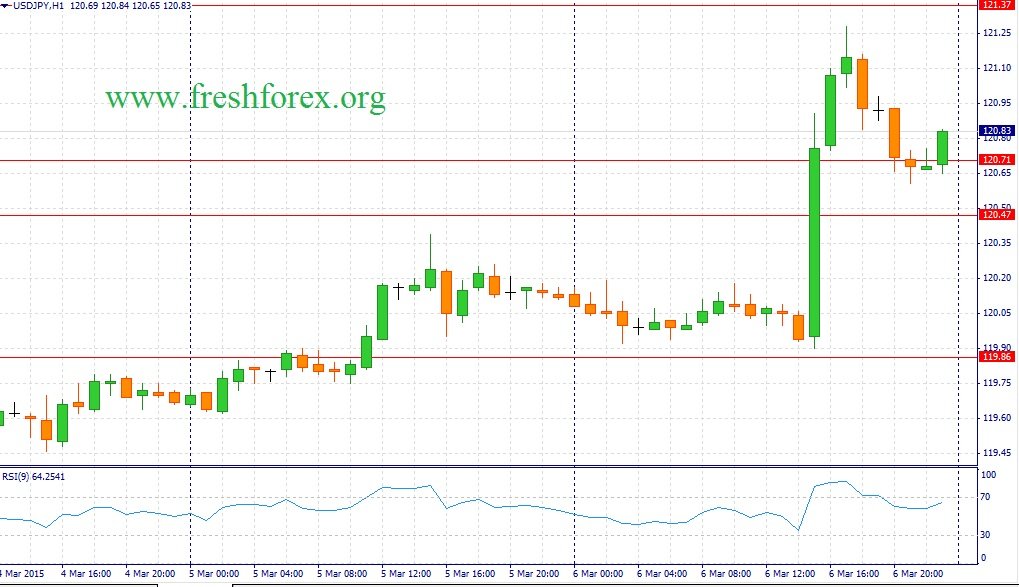 Рано утром Страна восходящего солнца опубликует окончательные данные по ВВП за 4 квартал. Как ожидают экономисты опрошенные агентством Bloomberg и в этой связи не следует ожидать сильной реакции со стороны участников рынка. Инвесторы в последний торговый день минувшей недели избавлялись от безопасных активов – японской йены и золота, что позволяет рассчитывать на рост котировок пары USD/JPY в краткосрочной перспективе. Дифференциал доходностей 10-летних государственных облигаций США и Японии в пятницу 6 марта расширился на 13 б.п., что является сильным бычьим фактором для гринбека. На этом фоне, в течение дня следует открывать позиции Buy на снижении котировок в область 120.45/120.15 и фиксировать прибыль в области 120.95. Необходимо выделить следующие уровни: уровни поддержки: уровни поддержки: 120.71 – 120.47 и уровни сопротивления: 121.37 – 121.84.