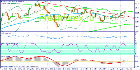GBP/USD укрепился до 1.57, обновив максимум месяца. Значимых экономических новостей нет. Голосование по Сирии в Конгрессе США перенесли с 9 на 11 сентября. Тренд восходящий, вероятный уровень коррекции - 1.5680/60.