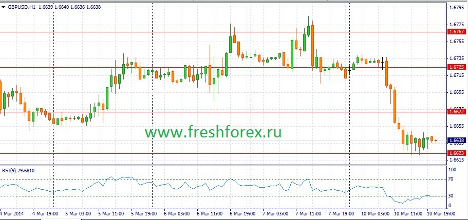 Еврозона и Штаты второй день подряд недели не порадуют участников рынка интересными макроэкономическими отчетами. Геополитическая напряженность сейчас угасает и вновь может обостриться после 16 марта, когда пройдет референдум на Украине, в Крыму. На этом фоне инвесторы будут отслеживать динамику торгов на фондовых площадках и по кросс-курсу EUR/GBP. Умеренный рост ведущих европейских фондовых индексов окажет умеренную поддержку паре EUR/USD. Комментарии главы Банка Англии Марка Карни приведут к всплеску волотильности в паре евро/фунт, что в свою очередь будет оказывать влияние на единую европейскую валюту. В целом по итогам дня можно ожидать развития боковой тенденции. На сегодня можно выделить следующие уровни. Уровни поддержки: 1.3810-1.3772 и уровни сопротивления: 1.3892-1.3968.