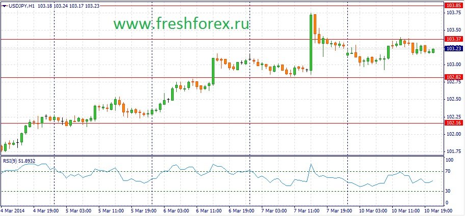 Банк Японии проведет сегодня своё очередное заседание. Накануне мы получили слабый отчет по ВВП за 4квартал 2013 года – темпы экономического роста по уточненным данным сократились с 1% до 0.7% в годовом исчислении, что может побудить японский регулятор пойти на увеличение стимулирующих мер в ближайшие месяцы. К тому же, уже в апреле в стране восходящего солнца будет повышен налог с продаж, что так же окажет негативный эффект на показатель ВВП. Дополнительное количественное смягчение это негатив для национальной валюты Японии и на этом фоне мы будем наблюдать спрос на пару USD/JPY. В целом, в течение дня, можно ожидать развития восходящей тенденции. На сегодня можно выделить следующие уровни. Уровни поддержки: 102.82 – 102.16 и уровни сопротивления: 103.37 – 103.91.