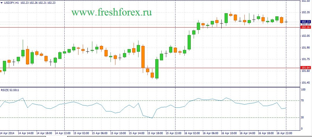 Несмотря на геополитические риски – инвесторы активно формируют длинные позиции на фондовых площадках, покупая бумаги на достаточно привлекательных уровнях для краткосрочной перспективы. Однако, в любой момент мы может увидеть усиление конфликта на Украине, что приведет к распродажам рисковых активов. На этом фоне, участникам торгов по паре доллар/йена следует быть очень осторожными. На сегодня намечено выступление главы Банка Японии Харухико Куроды, от которого не следует ждать сюрпризов. В целом, в течение дня можно ожидать развития боковой тенденции по паре доллар/йена. На сегодня можно выделить следующие уровни. Уровни поддержки: 102.16 – 101.64 и уровни сопротивления: 102.89 – 103.43.