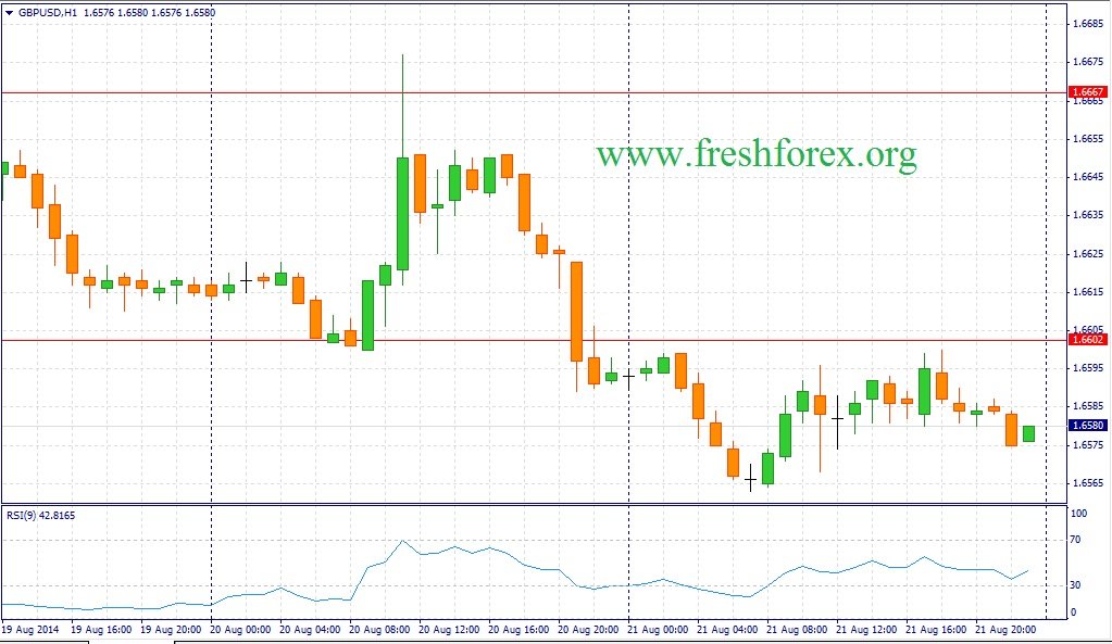 Сегодня участники рынка могут взять паузу для оценки перспектив британской валюты. Фунт стерлинг сейчас значительно перепродан и на фоне отсутствия публикации важной макроэкономической статистики -трейдеры могут начать частично фиксировать прибыль по коротким позициям. В этой связи сегодня можно ожидать развитие боковой тенденции в рамках диапазона 1.6540 -1.6640. С учетом того, что в понедельник 25 августа в Великобритании будут банковские выходные – сейчас не стоит рассчитывать на продолжение нисходящей тенденции. Необходимо выделить следующие уровни по паре фунт/доллар. Уровни поддержки:1.6580 – 1.6554 и уровни сопротивления: 1.6602 – 1.6667.