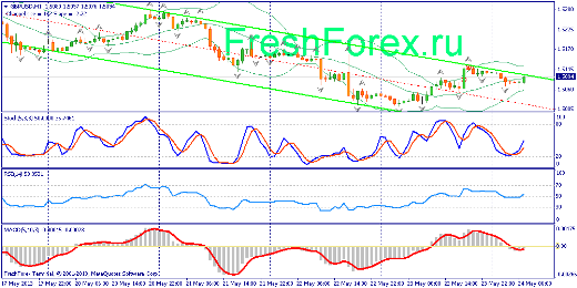Среднесрочная картина. Закрытие выше 20-дневной скользящей средней на 1.2961 необходимо, чтобы подтвердить, что 17 мая был обозначен среднесрочный минимум на 1.2796. Если возобновится падение с максимумом мая, то минимум апреля на 1.2751 является следующей целью вниз. Первым сопротивлением является 20-дневная скользящая средняя на 1.2961. Второе сопротивление – на психологическом уровне 1.3000. Первая поддержка, удерживающая пару от падения всю неделю – на 1.2830, вторая - минимум прошлой пятницы на 127.98. Третья поддержка - минимум апреля на 127.51.