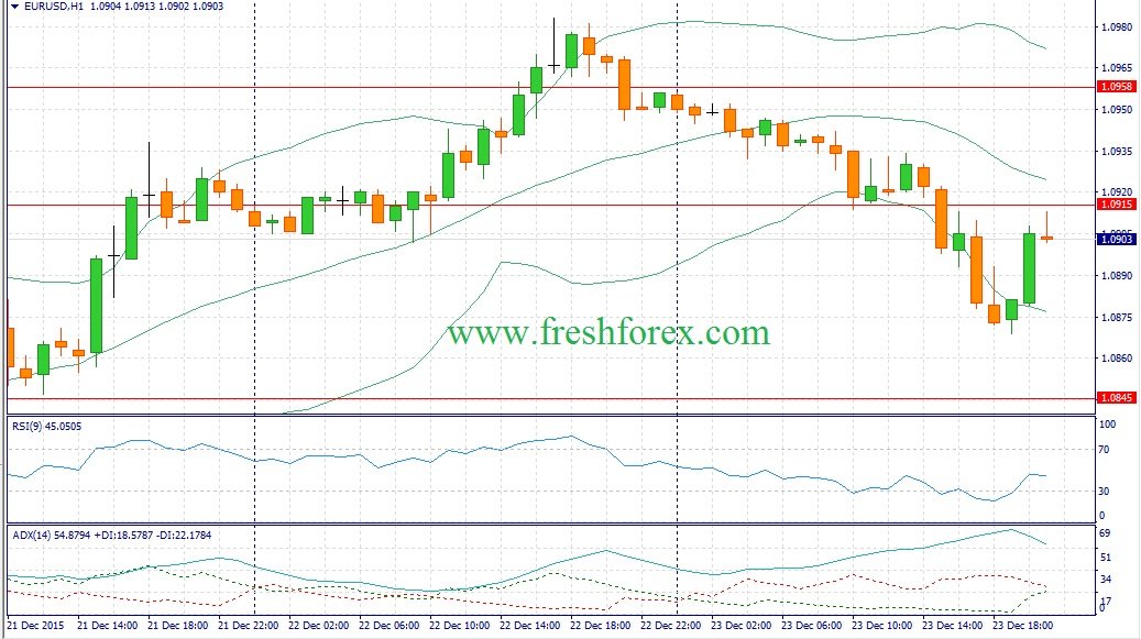 Данные факторы указывают на наличие большого числа покупателей, причем эти покупатели обладают настолько глубокими “карманами”, что готовы сдерживать мощный негативный фронт. В этой связи, в краткосрочной перспективе (до конца года) можно ожидать плавного роста котировок в основной валютной паре. В течение дня следует ожидать бокового тренда на фоне низкой ликвидности рынка. Банки в Германии сегодня закрыты, в США торговая сессия завершится на несколько часов раньше. Весь западный мир находится в преддверии главного праздника года – Рождества. Из макроэкономических релизов сегодня следует выделить лишь данные по заявлениям на пособие по безработице, однако и этот отчет сегодня не сможет “раскачать” рынок. На этом фоне, в течение дня следует ожидать флэта в рамках диапазона 1.0850 -1.0955.