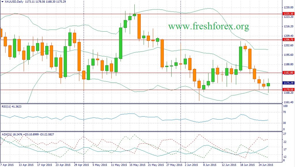 В течение недели следует ожидать развитие восходящей тенденции. Во-первых, Греция в минувшие выходные не смогла договориться со своими кредиторами, что усиливает финансовые риски в еврозоне. В периоды финансовой нестабильности драгоценный металл традиционно пользуется спросом. Во-вторых, доходность американских 10-летних казначейских облигаций на минувшей недели подросла на 19 б.п. до уровня 2.47%, что указывает на рост инфляционных ожиданий в США и также является позитивным фактором для золота. На этом фоне, в течение недели следует открывать позиции Buy на снижение котировок в область 1172/1162 и фиксировать прибыль отметке 1190.