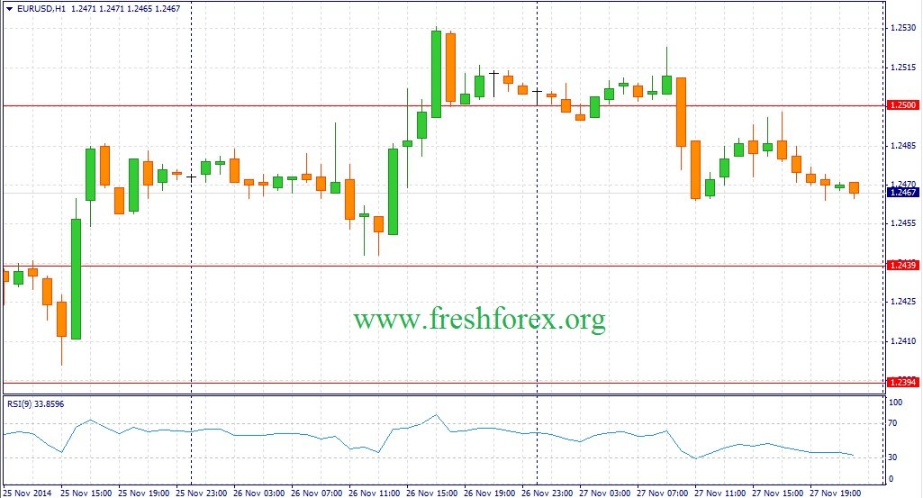 Саммит ОПЕК состоялся и наши ожидания оправдались – уровень добычи нефти остается прежним, несмотря на сильные разногласия внутри картеля. На этом фоне мы увидели мощное “медвежье ралли” по черному золоту – нефти марки WTI впервые за последние 4 года опустилась ниже отметки 70$/баррель. Пара EUR/USD после трёхдневного роста в четверг находилась под давлением – предварительные данные по инфляции в Испании и Германии не порадовали трейдеров позитивными релизами. Выступавший в Хельсинки глава ЕЦБ Марио Драги вновь подчеркнул, что монетарные власти готовы пойти на увеличении стимулов в случае необходимости и даль поручение своим коллегам провести дополнительный анализ. Снижение котировок нефти в совокупности с негативным внутренним фоном оказали давление на евро и по итогам дня пара EUR/USD похудела на 0.3%, завершив торги на отметке 1.2470.