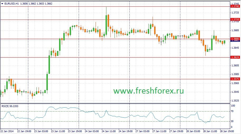 Представители FOMC Плоссер и Фишер выступавшие в середине января указали о правильности курса на сокращение стимулирующих мер. На этом фоне будет наблюдаться спрос на американскую валюту. Однако не исключено, что перед снижением сначала мы можем увидеть рост пары евро/доллар в область 1.3750, после чего произойдет укрепление доллара. В целом, по итогам дня можно ожидать развития нисходящей тенденции. На сегодня можно выделить следующие уровни. Уровни поддержки: 1.3666- 1.3624- 1.3575 и уровни сопротивления: 1.3666-1.3710 1.3740.