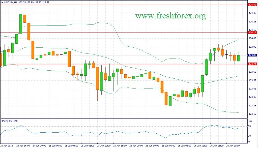 Позитивная макроэкономическая статистика из Японии, с одной стороны и отсутствие договоренности между Грецией и тройкой кредиторов с другой стороны будут способствовать распродажам корпоративных бумаги на фондовой бирже в Токио, что вызовет волну фиксации сделок carry trade и поддержит спрос на японскую йену. На этом фоне в течение дня следует открывать позиции Sell на росте котировок в область 123.90/124.20 и фиксировать прибыль на отметке 123.20. Необходимо выделить следующие уровни: уровни поддержки: уровни поддержки: 123.74 – 122.90 и уровни сопротивления: 124.12 – 124.45.