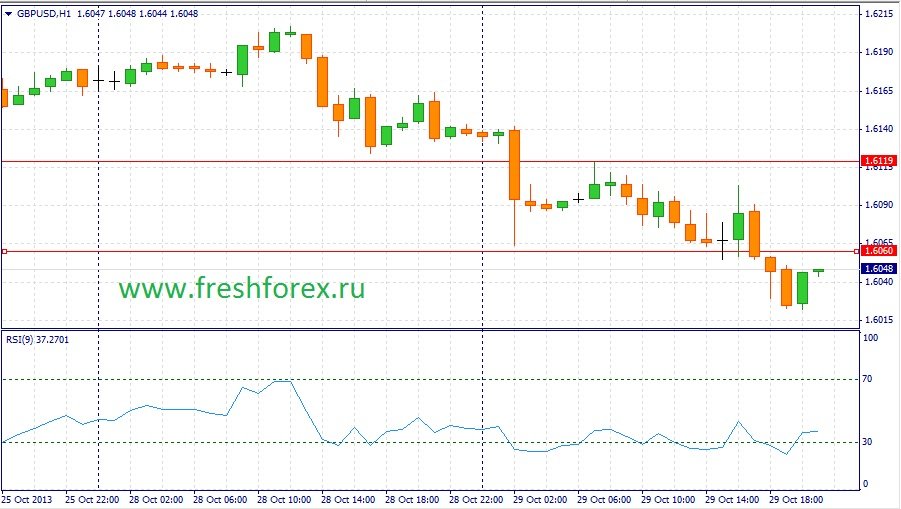 В европейскую сессию будут опубликованы данные по рынку труда в Германии. В октябре ожидается сокращение числа безработных, что окажет поддержку котировкам евро. И всё же, сегодня главным ньюзмейкером выступит ФРС США. Трейдеры и инвесторы перед заседанием Центробанка Америки будут осторожно выстраивать свои позиции. На наш взгляд сюрпризов от Бена Бернанке и его коллег сегодня рынок не увидит. Ряд негативных данных из США опубликованных в последний месяц указывает на то, что монетарная политика останется без изменений. К тому же из-за бюджетного кризиса в штатах, много статистики попросту не было публиковано, что является еще одним весомым минусом для ФРС. И все это безусловно будет оказывать давление на доллар. Но большого роста европейской валюты ожидать не стоит, многие факторы уже заложены в котировки и может сработать известный биржевой принцип - “покупай на слухах, продавай на фактах” В случае преодоления уровня сопротивления 1.3830, котировки пары евро/доллар могут вырасти до отметки 1.3870.