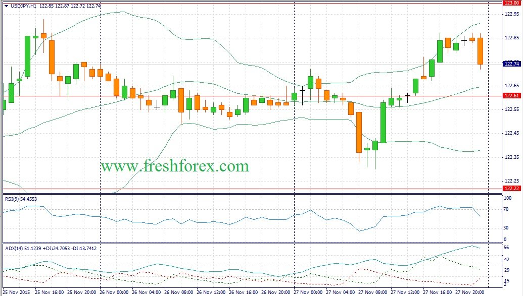 Цены на нефть и промышленные металлы снижаются, что оказывает поддержку американской валюте, поскольку стоимость биржевых товаров деноминирована в долларах. В пятницу на долговом рынке наблюдалось расширение дифференциала доходности государственных облигаций США и Японии, что формирует первый сигнал на завершении технической коррекции, которая наблюдается с 18 ноября. Однако здесь торопиться не стоит и лучше дождаться позитивной динамики в понедельник. На этом фоне в течение дня следует ожидать флэта в рамках диапазона 122.15 -123.05. Необходимо выделить следующие уровни: уровни поддержки: уровни поддержки: 122.61 – 121.22 и уровни сопротивления: 123.00 – 123.60.