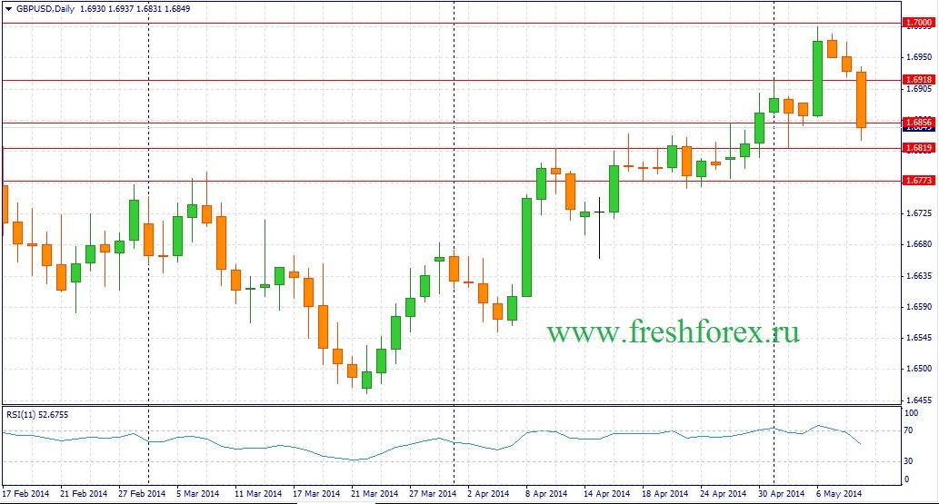 Среда 14 мая - ключевой день для британской валюты. На эту дату запланирована публикация релиза по уровню безработицы за март, а так же отчет Банка Англии по инфляции за 2 квартал. Что касается первого показателя – здесь можно выхода данных на уровне медианы прогнозов. Отчет монетарного регулятора по инфляции безусловно привлечет внимание участников валютного рынка. Если мы увидим повышение оценки темпов экономического роста, а так же роста инфляционного давления – можно ожидать спроса на фунт стерлингов и роста котировок в область 1.6930. На больший рост рассчитывать не приходится в виду ожиданий умеренно позитивной макроэкономической статистики из Штатов. В противном случае, “кабель” кабель будет повторять динамику торгов единой европейской валюты и ближайшей поддержкой выступит отметка 1.6754.