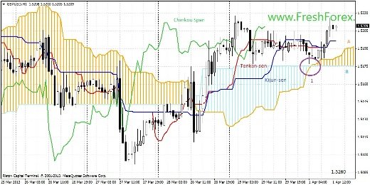 Описание сигналов индикатора: Тенкан в переплетении с Киджун. Цена выше линий и облака. Облако развернулось и направлено на рост (1). Краткосрочный прогноз: цена выше линий, линии в переплетении, но можно ожидать формирование «золотого креста». Облако развернулось и направленно на рост. Вырисовывается картина сочетания трех сигналов Цена – Тенкан – Киджун – Облако. Можно говорить о росте цены до 1.5260.