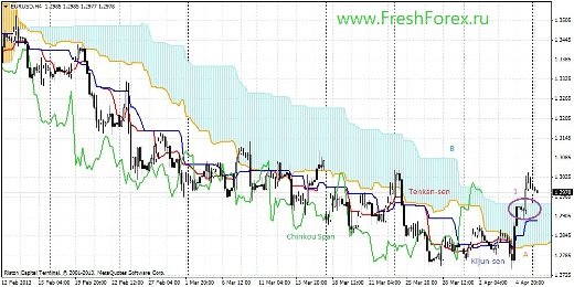 Описание сигналов индикатора: Тенкан выше Киджун. Цена между линиями. Облако развернулось на рост (1). Краткосрочный прогноз: Линии Тенкан и Киджун выше облака, цена находится между линиями. Облако развернулось на рост. Можно говорить о росте цены до 1.3030.