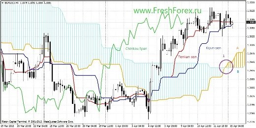 На сегодняшний день линия Тенкан и Киджун пересеклись в облаке «Золотым крестом» (1). Цена в облаке между линиями. Облако растущее. Как мы видим, линии пересеклись «золотым крестом» в облаке вблизи Сенкоу спан А. Цена пробивает Киджун и стремится к Сенкоу спан А. Облако в свое время растущее, но как мы видим, сужается и готовится к развороту. Чинкоу спан пересекает цену снизу вверх, что является сигналом к росту цены (2). Пока на рынке флет, для краткосрочных позиций входить в рынок опасно.